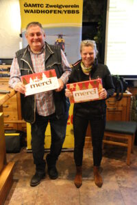 Kurt Hraby ließ es sich nicht nehmen, im Namen aller Anwesenden zunächst Christiane Gerstner als fleißiger Assistentin des Obmannes für ihren großen Einsatz bei Planung und Organisation der durchgeführten Veranstaltungen zu danken und dann auch dem Obmann Anton Durstberger für seinen unermüdlichen Einsatz bei allen 15 Events zuzüglich der bisher 11 Clubabende herzlichen Dank auszusprechen und jedem eine große Tafel Schokolade „merci Finest Selection“ zu überreichen.