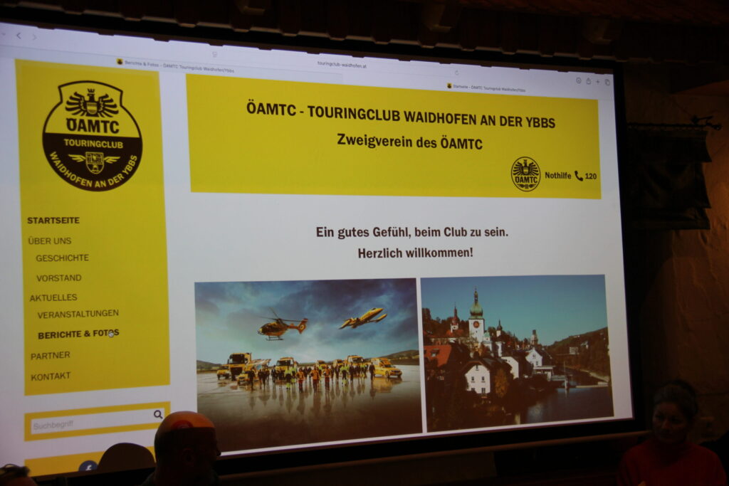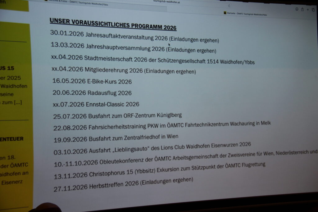 Nach der Begrüßung gab Obmann Anton Durstberger anhand der auf der Website www.touringclub-waidhofen.at unter AKTUELLES, BERICHTE & FOTOS einsehbaren Berichte einen Überblick über die abgehaltenen Veranstaltungen des Jahres 2025. Er hob dabei den E-Bike-Kurs am Eurospar-Parkplatz, den Radausflug nach Lunz mit Besichtigung des Hauses der Wildnis, den Besuch des Finales der Ennstal-Classic in Gröbming hervor. Als besondere Highlights führte er die Besuche des Red Bull Ringes in Spielberg, Abenteuer Erzberg in Eisenerz sowie Christophorus 15 in Ybbsitz an. Weiters präsentierte Anton Durstberger die für das Jahr 2026 geplanten Vorhaben des Clubs. Zu guter Letzt bedankte er sich noch bei seinen Mitarbeitern, ohne die das alles nicht gelingen könnte, insbesondere bei Erna Tatzreiter für Website- und Pressearbeit, bei Harald Laresser und Leopold Schörghuber für Foto, Film und Ton, bei Christiane Gerstner für die Planung der diversen Ausflüge und bei den vielen, die im Hintergrund den Club noch unterstützen.
